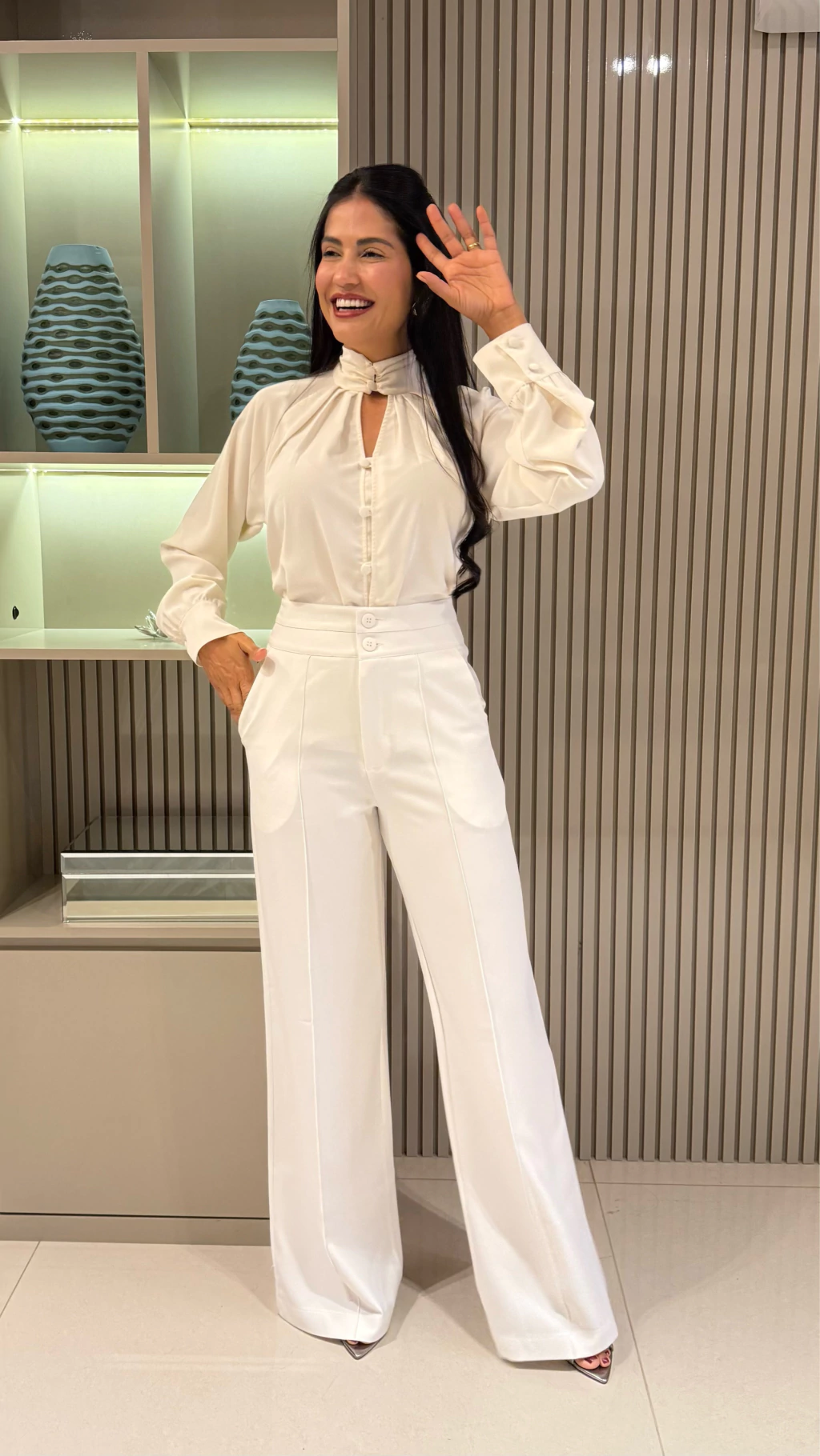 Elegância atemporal com toque de modernidade. Com ótimo caimento, essa calça apresenta modelagem de alfaiataria com cintura alta, bolsos frontais amplos e detalhe de botões duplos no cós. O friso frontal alonga a silhueta e valoriza a postura. Perfeita para produções sofisticadas no trabalho, eventos ou para um look chic no dia a dia.