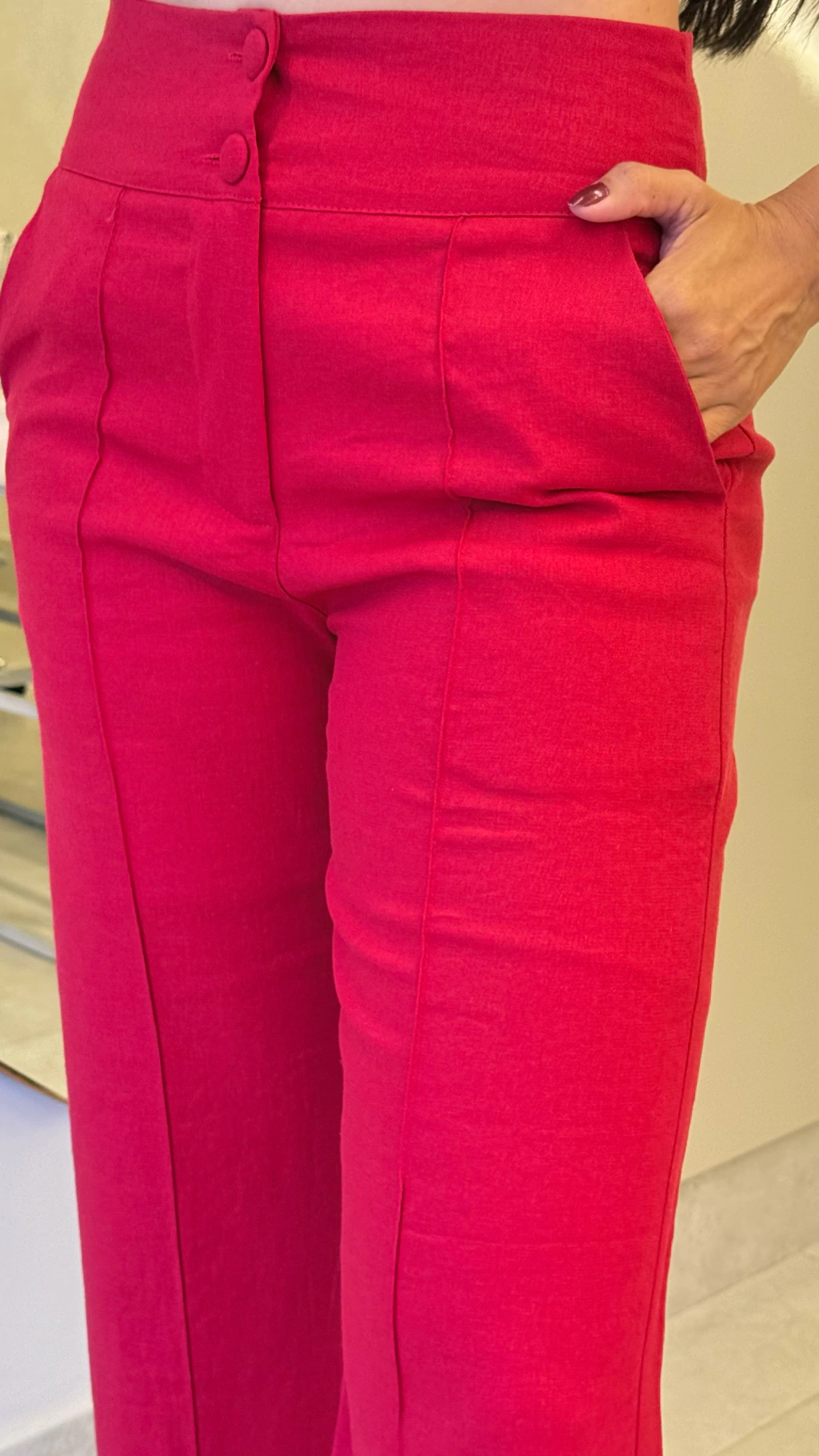 Calça de alfaiataria em vermelho, com corte preciso e acabamento impecável. Modelagem de cintura alta, que valoriza a silhueta e alonga a perna, com frente levemente estruturada e caimento reto elegante. O tecido tem presença, não marca e entrega conforto ao vestir, mantendo a sofisticação do início ao fim do dia. O tom de vermelho traz força, modernidade e posicionamento — uma peça-chave para produções elegantes e atuais.