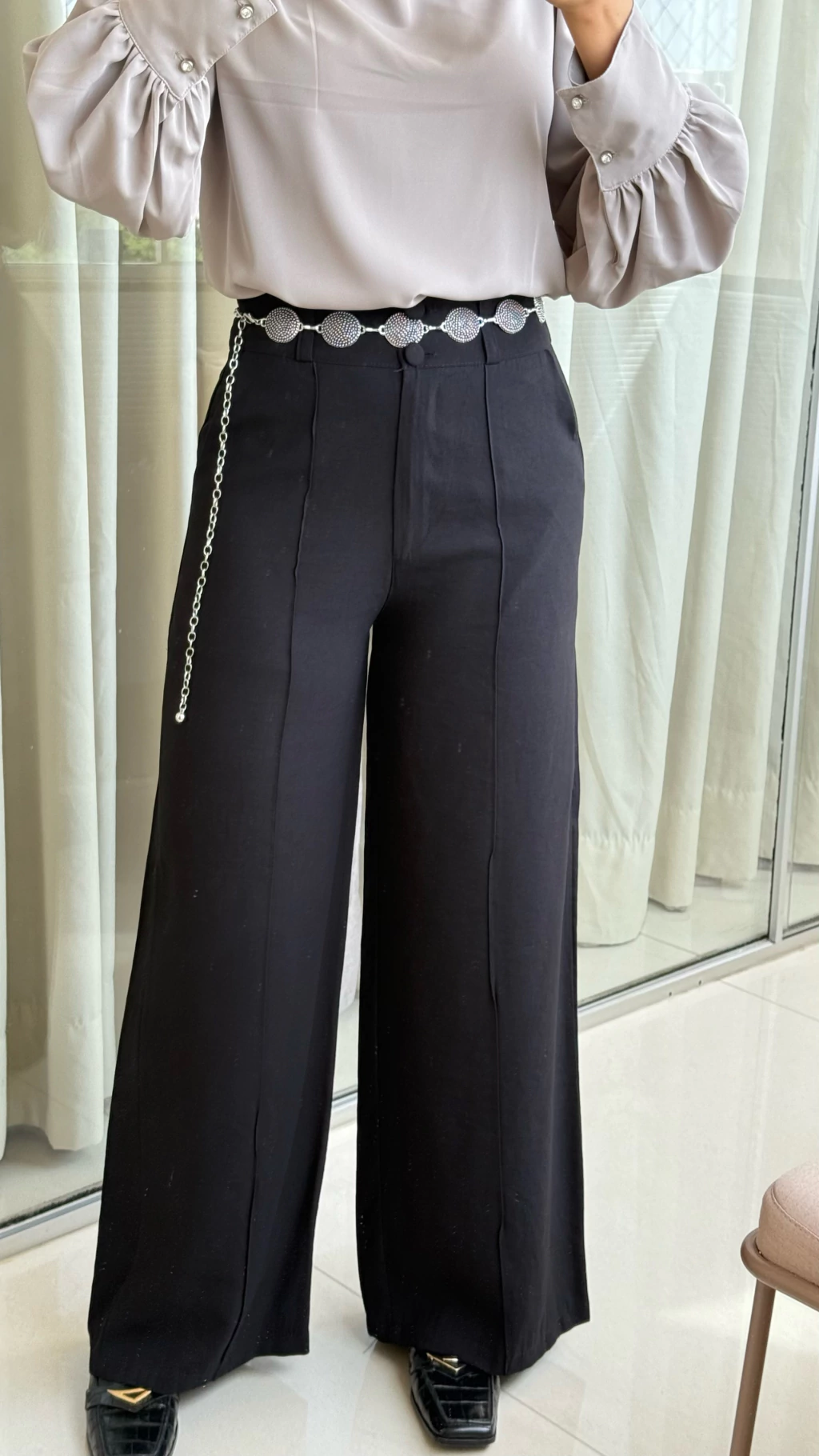 Elegante, sofisticada e atemporal — essa calça pantalona é confeccionada no tecido Marant, conhecido pelo seu toque estruturado, caimento impecável e acabamento refinado. O modelo de cintura alta valoriza a silhueta e alonga a perna, enquanto os dois botões encapados na parte frontal trazem um charme extra e acabamento delicado.