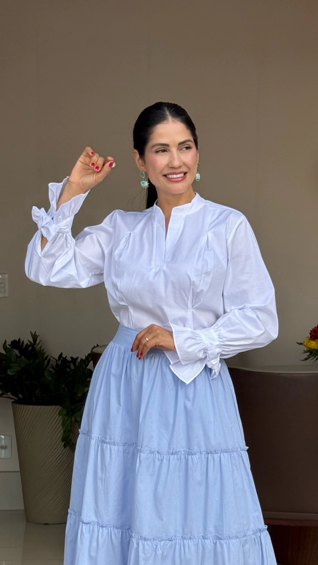 Camisa feminina em algodão branco, com modelagem soltinha que garante conforto e elegância no dia a dia. Possui decote em V discreto, mangas longas com detalhe em laço nos punhos e recortes estratégicos que valorizam a silhueta. Uma peça versátil e sofisticada para compor looks do casual ao chic.