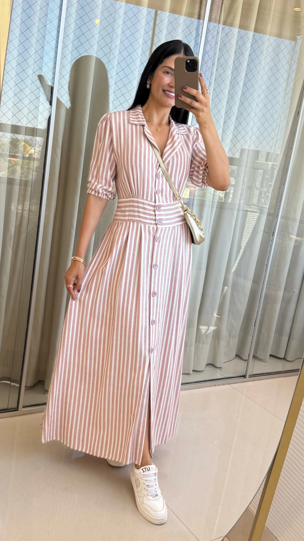 Com listras clássicas, modelagem acinturada e fechamento por botões, esta chemise traduz sofisticação e frescor em uma única peça. Ideal para compor produções leves, versáteis e cheias de estilo.
