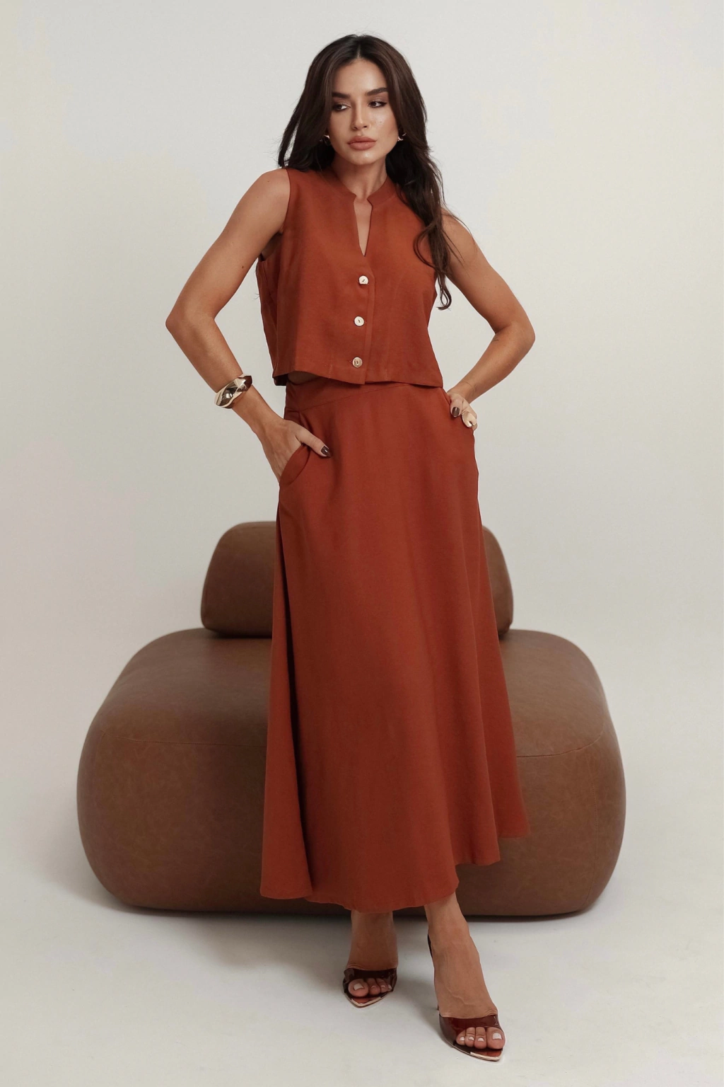 Conjunto Mairene é a escolha ideal para quem busca elegância com leveza. Composto por cropped sem mangas com abotoamento frontal e gola com fenda discreta, e uma saia longa com bolsos funcionais, traz caimento impecável e tom telha terroso que transmite sofisticação natural. Perfeito para compor looks modernos e atemporais.