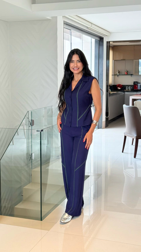 om um design moderno e confortável, este conjunto une a elegância da alfaiataria com o toque casual dos detalhes esportivos. O corte reto alonga a silhueta, enquanto as linhas contrastantes valorizam a peça com sofisticação. Ideal para quem busca estilo sem abrir mão do conforto.