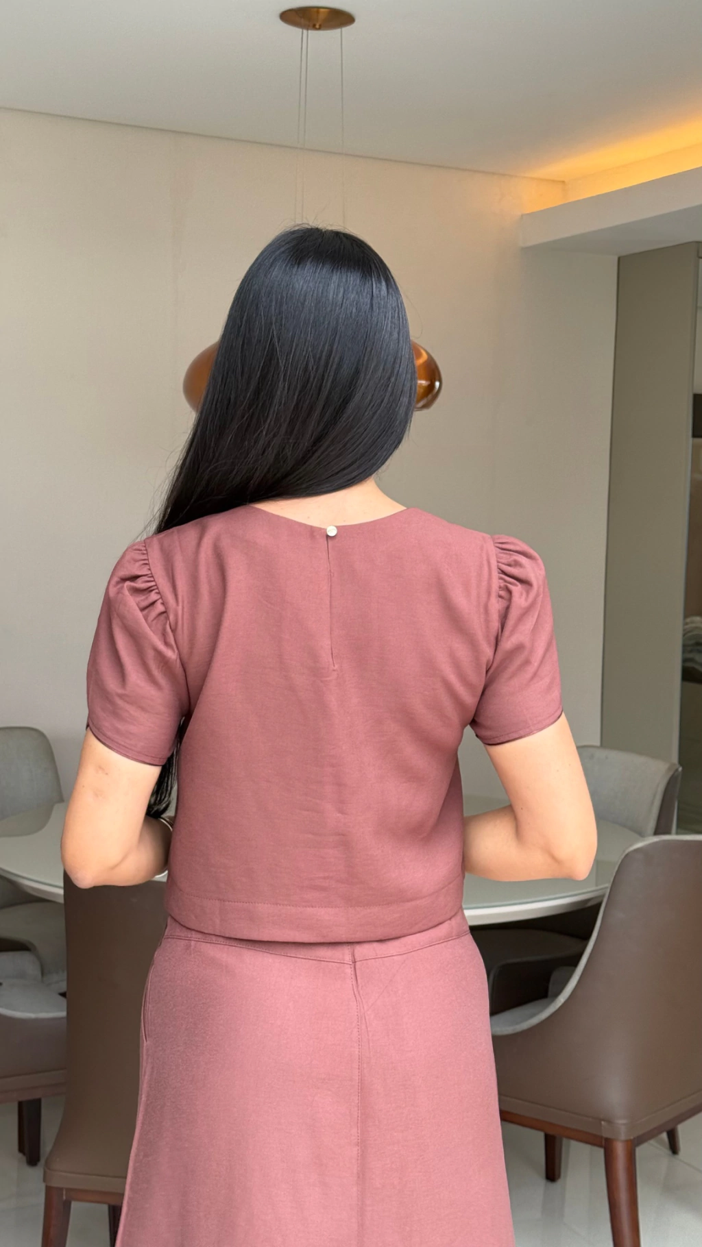 A blusa possui mangas curtas levemente bufantes e um corte reto, que confere charme e versatilidade. A saia longa com fenda frontal e bolsos decorativos oferece um toque de ousadia na medida certa, além de detalhes refinados como o fechamento por botão e zíper invisível.