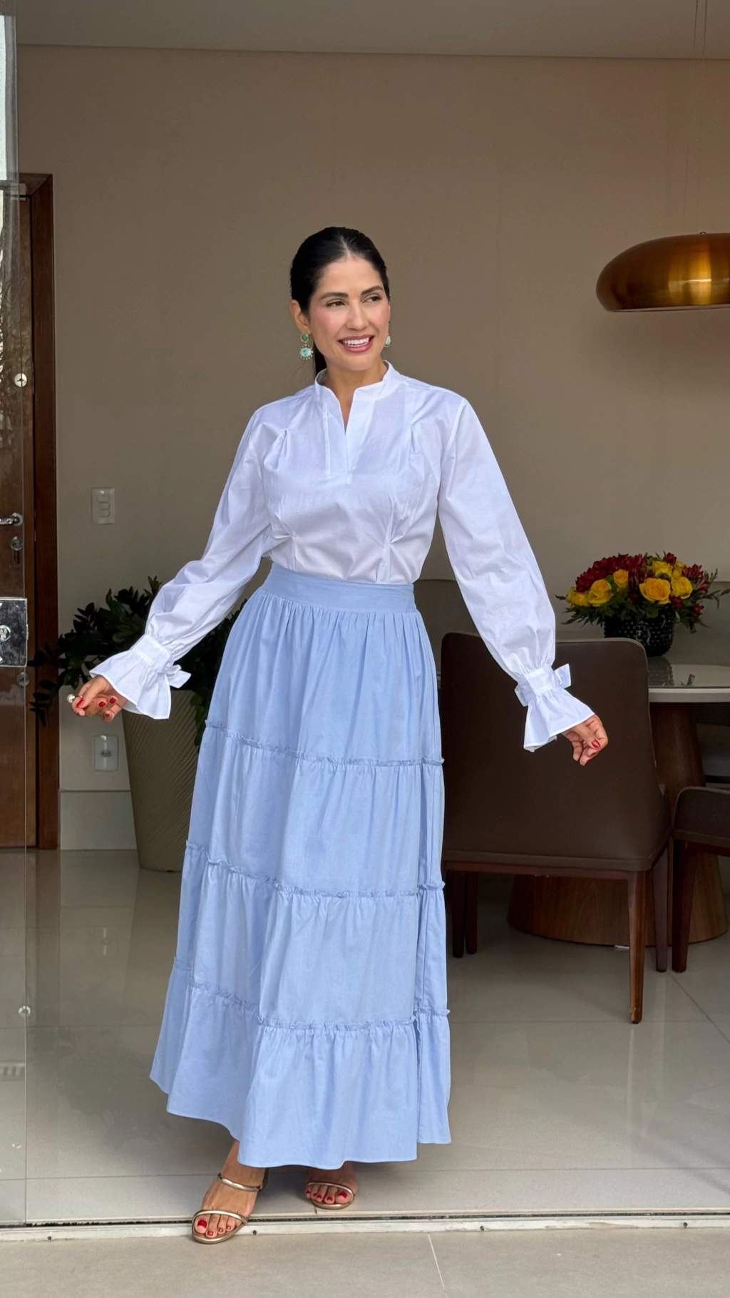 Saia longa em camadas, confeccionada em tecido leve e fluido, que proporciona movimento e frescor ao look. Com cintura alta e detalhe franzido, valoriza a silhueta e garante conforto no uso diário. Versátil e elegante, é a escolha perfeita para composições do dia a dia ou produções mais sofisticadas.