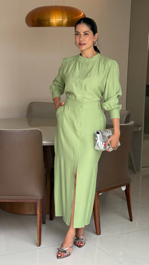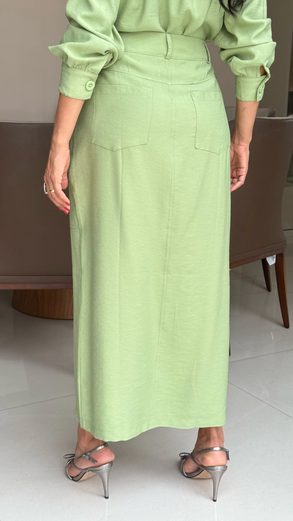 Saia midi em tom verde suave, com modelagem elegante e fechamento frontal por botões. Versátil e atemporal, é perfeita para compor produções sofisticadas e modernas em qualquer ocasião.
