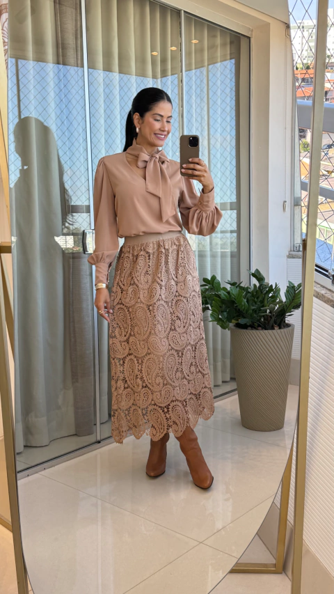 A Saia Midi Renda Celina é a peça perfeita para quem busca sofisticação e delicadeza em um único look. Com design elegante, ela é confeccionada em renda trabalhada de padrão paisley, trazendo um toque romântico e atemporal para produções mais refinadas.