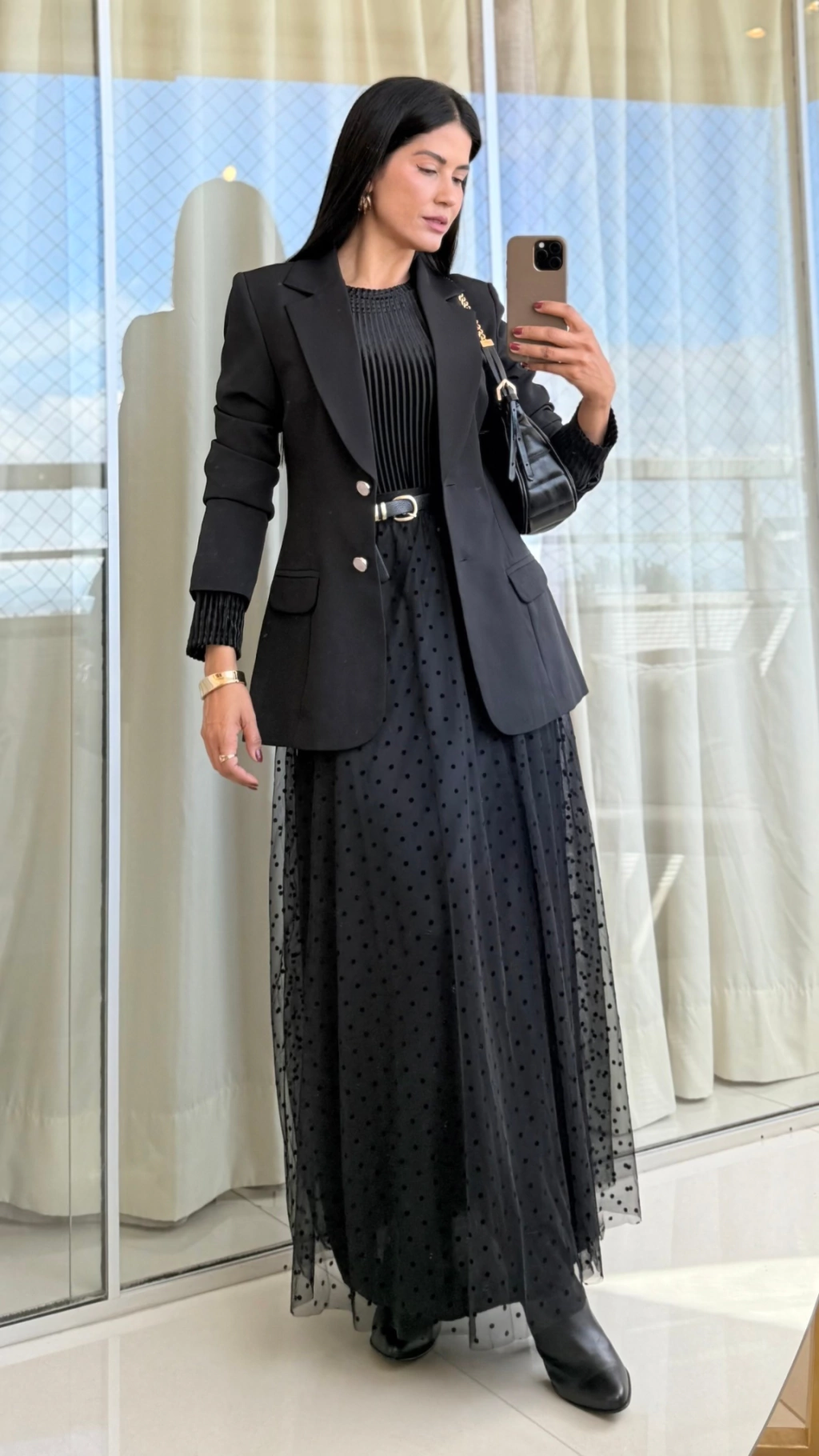 Aposte no charme e sofisticação da Saia Tule Poá Preta para compor looks elegantes e femininos. Com modelagem longa e fluida, a peça é confeccionada em tule leve com textura de poás (bolinhas) em relevo, trazendo um toque romântico e moderno ao visual. Possui forro interno confortável e cós ajustado que valoriza a silhueta. Ideal para combinações com camisas, blusas de tecido ou tricôs, tanto para eventos casuais quanto produções mais refinadas.