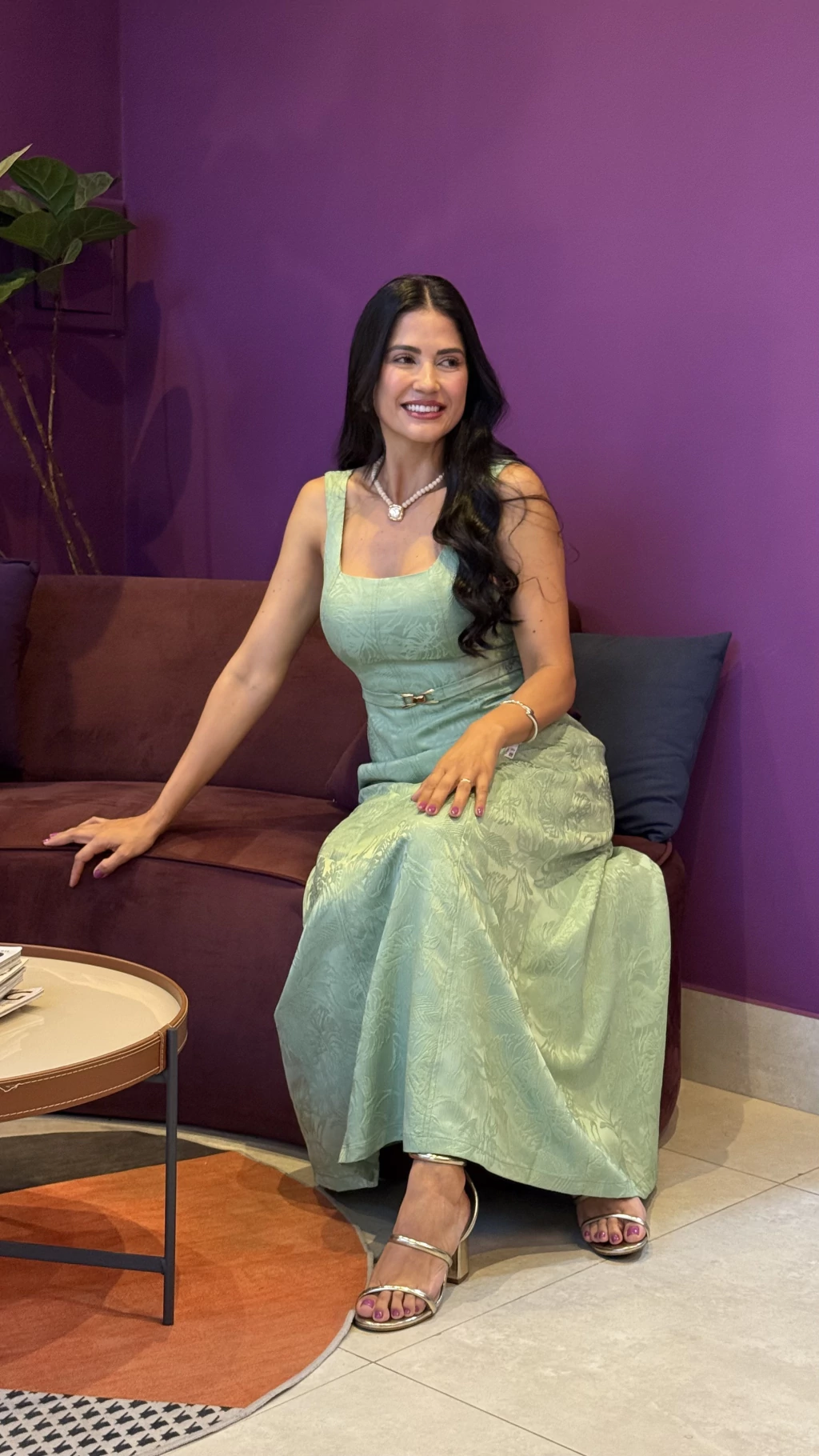 Elegância e leveza em cada detalhe.Nosso vestido longo em tom verde menta traz uma textura floral sofisticada e cinto delicado, realçando a silhueta com sutileza.Ideal para ocasiões especiais ou produções elegantes do dia a dia.