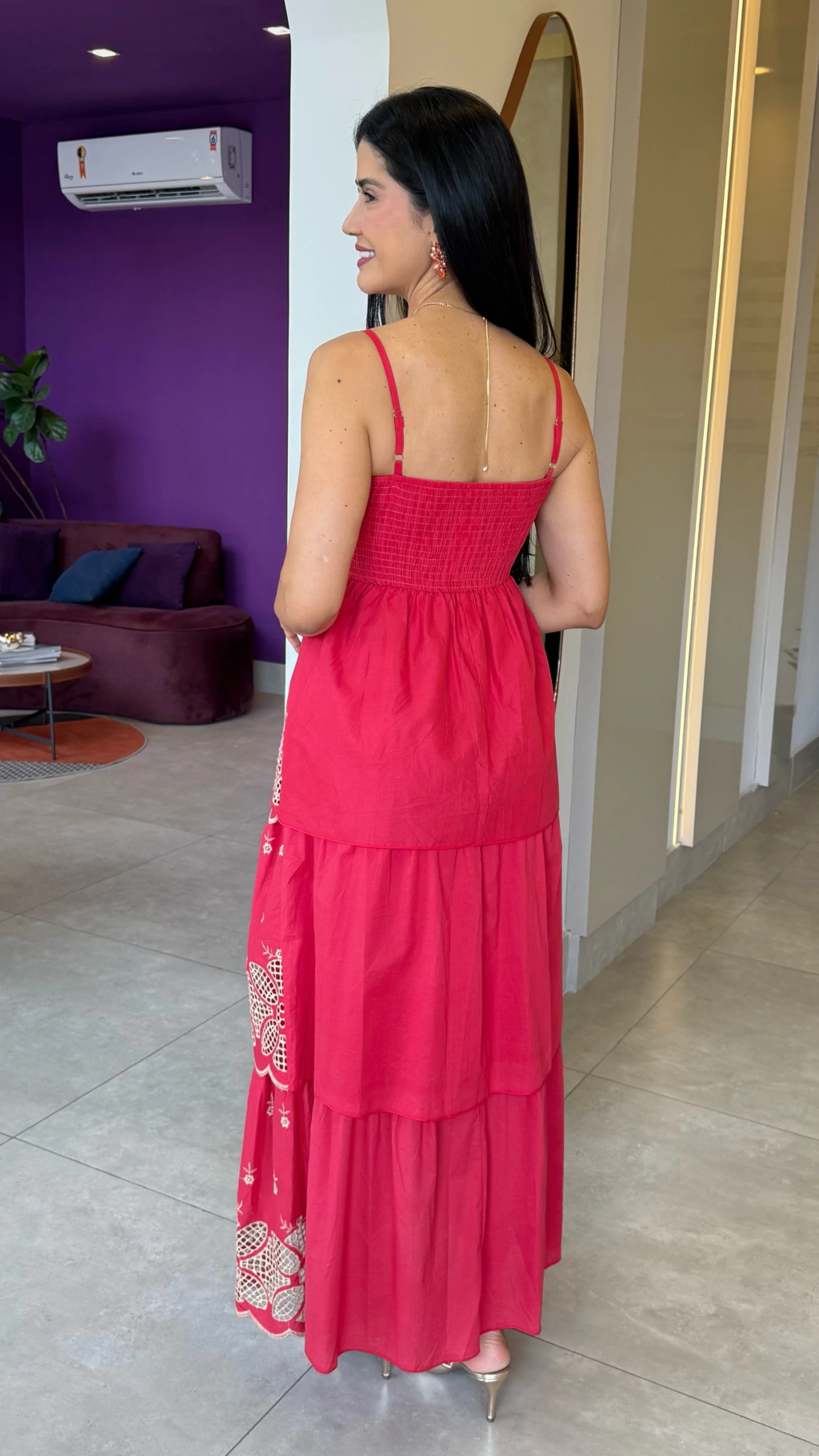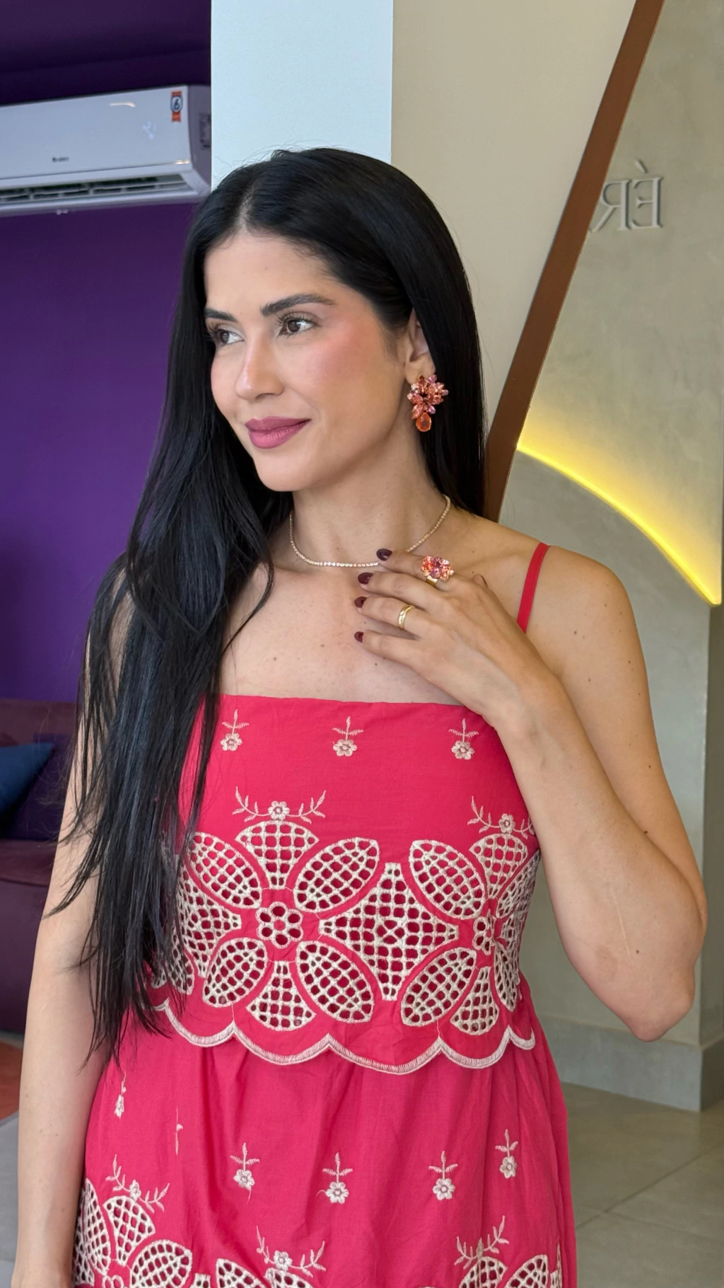 Presença, cor e elegância no ponto certo. Este vestido valoriza o visual com um trabalho vazado sofisticado e um tom vibrante que transmite confiança e feminilidade. A modelagem fluida garante leveza ao vestir, enquanto as camadas trazem movimento e impacto. Ideal para eventos diurnos, almoços especiais, celebrações ao ar livre ou ocasiões em que o look precisa falar antes de qualquer palavra. É a escolha de quem entende que elegância também pode ser marcante.
