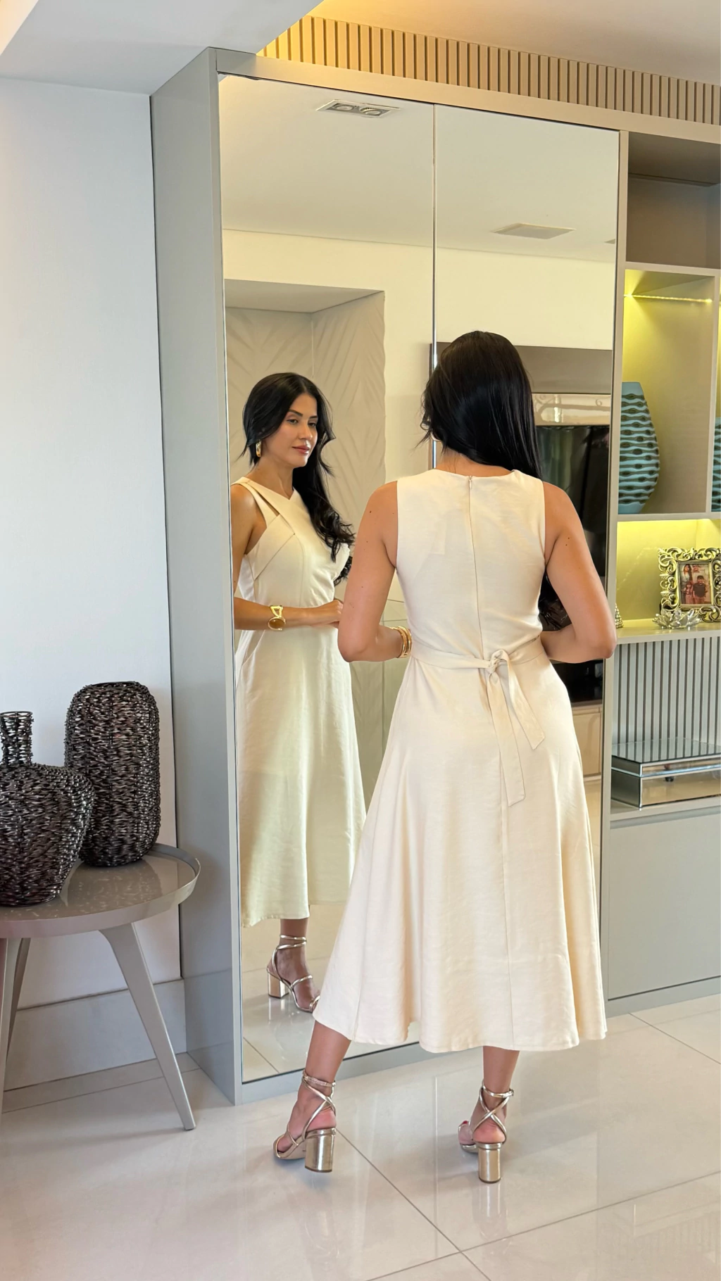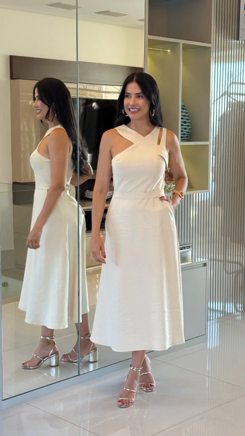 Elegante e sofisticado, este vestido midi off-white apresenta design assimétrico no decote com detalhe cruzado, valorizando o colo com modernidade. Confeccionado no tecido marant, de caimento leve e fluido, possui modelagem acinturada que realça a silhueta e comprimento clássico para diversas ocasiões. Ideal para eventos especiais, combina perfeitamente com acessórios dourados ou prateados.