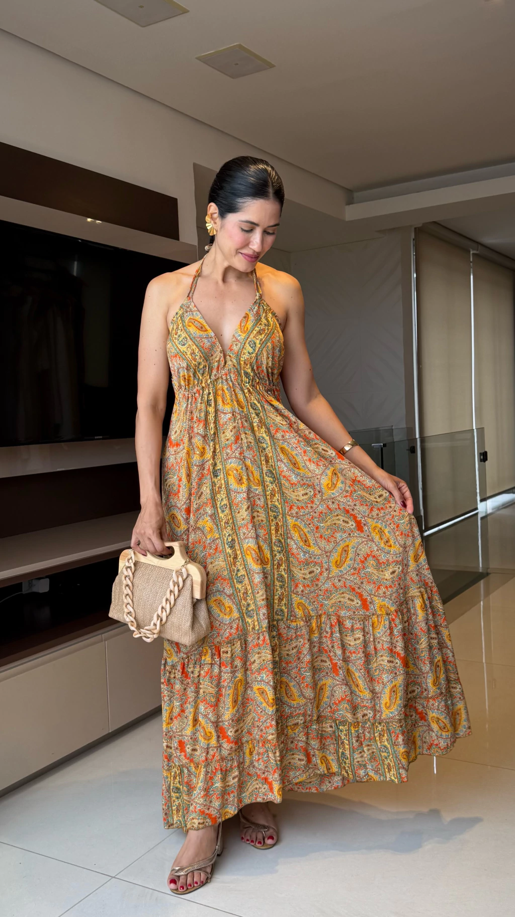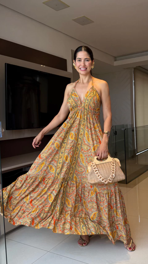 Intenso, elegante e absolutamente marcante. Esta versão traz uma paleta quente que valoriza a pele, com estampa rica e movimento impecável. Um vestido que transmite personalidade, sofisticação e presença, ideal para quem não passa despercebida — do dia especial ao evento que pede impacto e estilo.