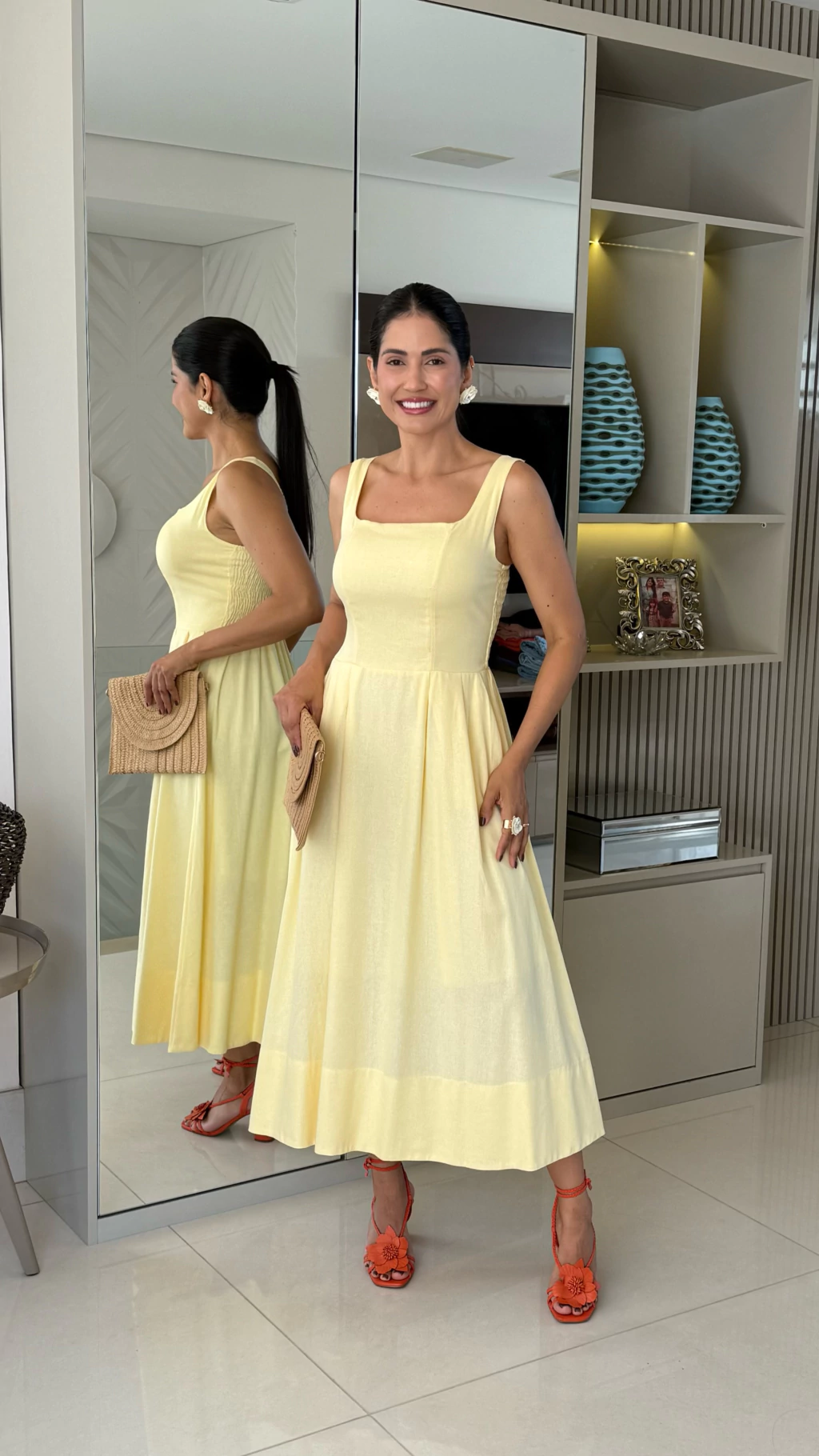 O Vestido Marly é aquele modelo atemporal que combina leveza, feminilidade e conforto em uma só peça. Confeccionado em tecido leve e com caimento impecável, ele se ajusta ao corpo sem marcar e valoriza a silhueta com o recorte fluido da saia midi.