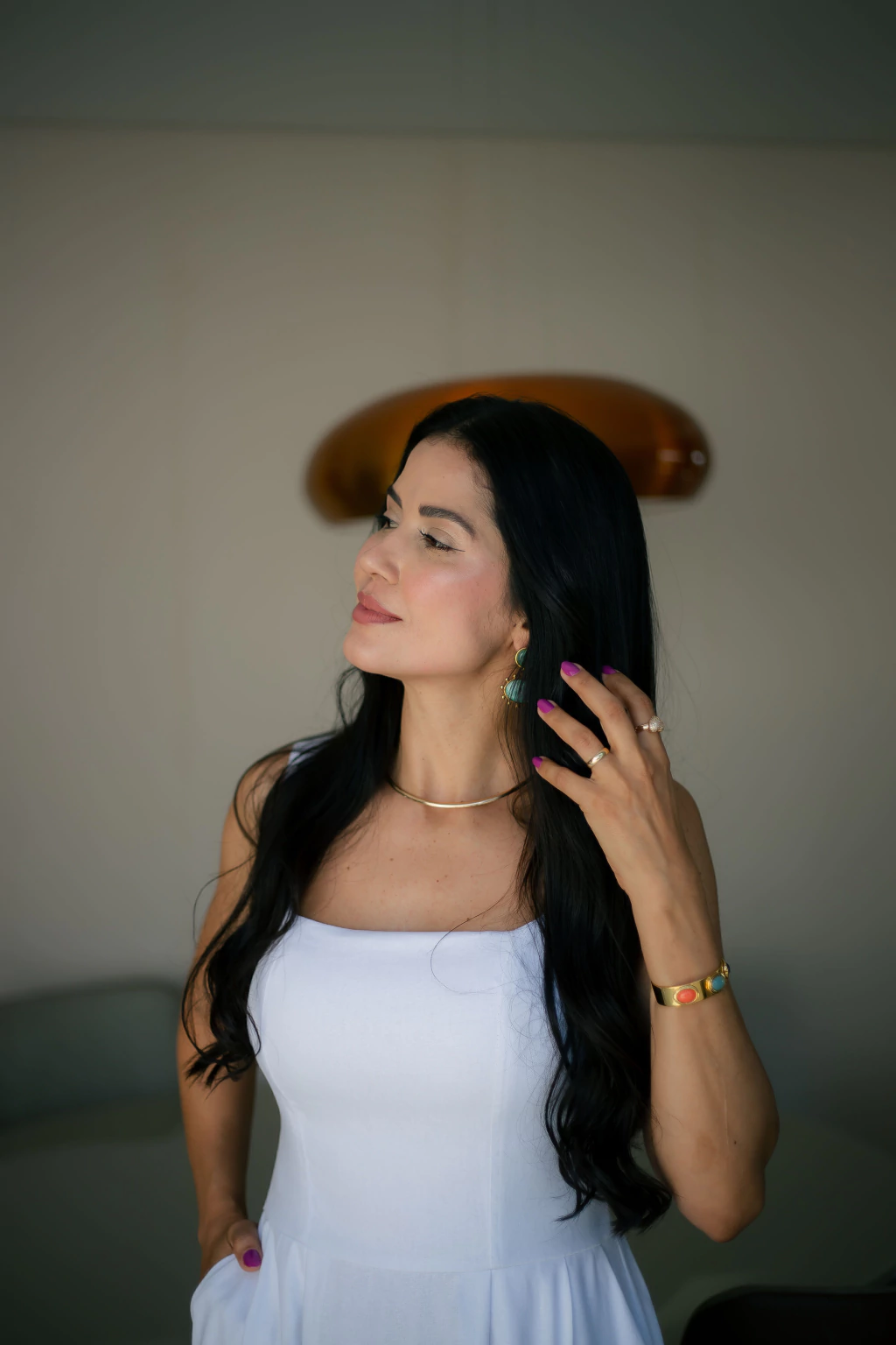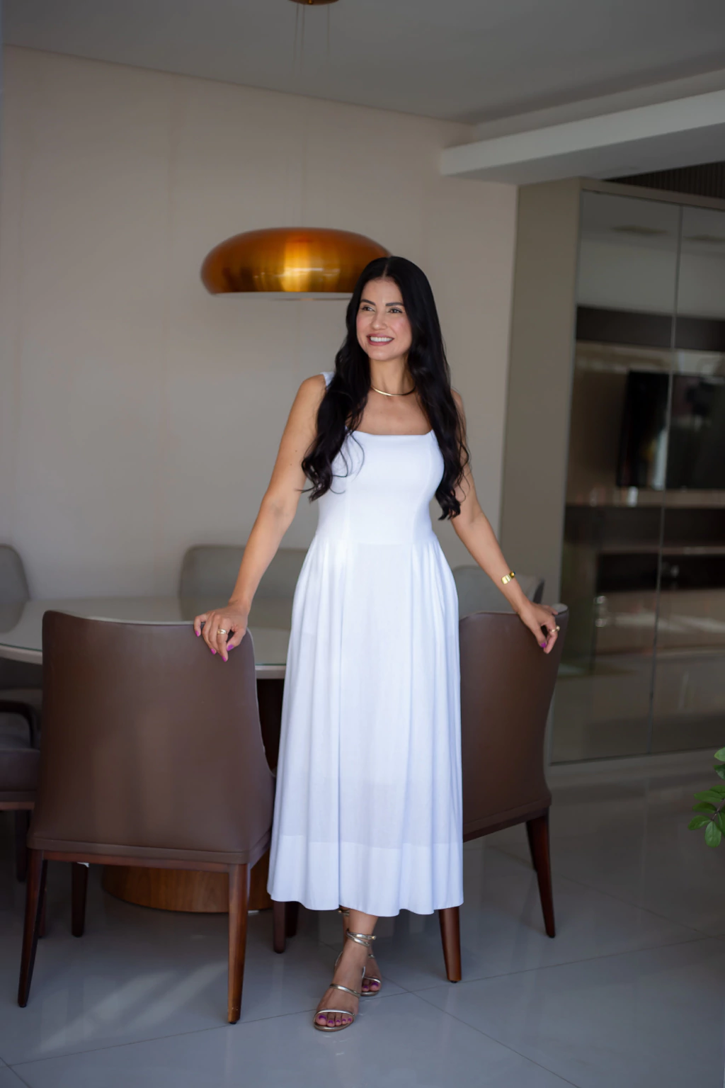 O Vestido Marly é aquele modelo atemporal que combina leveza, feminilidade e conforto em uma só peça. Confeccionado em tecido leve e com caimento impecável, ele se ajusta ao corpo sem marcar e valoriza a silhueta com o recorte fluido da saia midi.