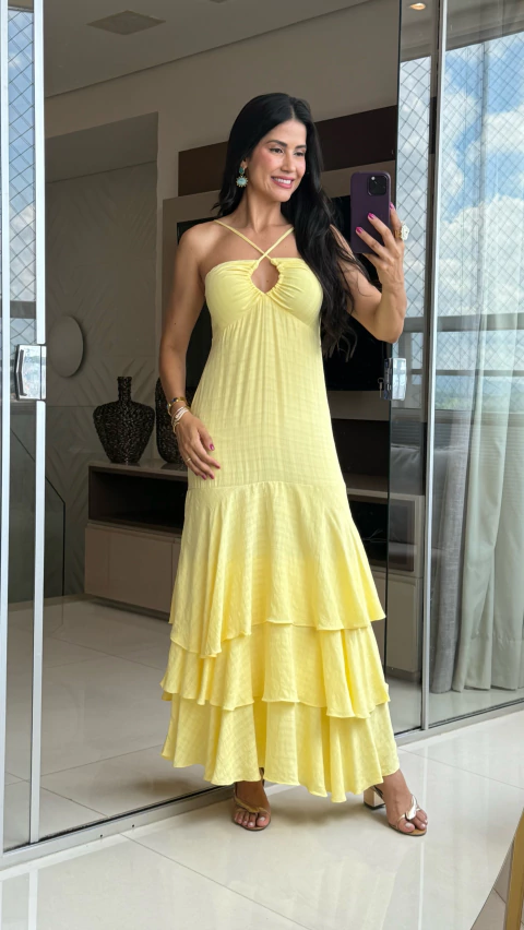 Vestido Tammy é um modelo leve, marcante e pronto para iluminar qualquer ocasião. Modelagem fluida, camadas que dão movimento e o tom amarelo perfeito para dias de sol, encontros especiais, viagens e até um almoço elegante. Uma peça que entrega presença sem esforço do jeito que você ama.