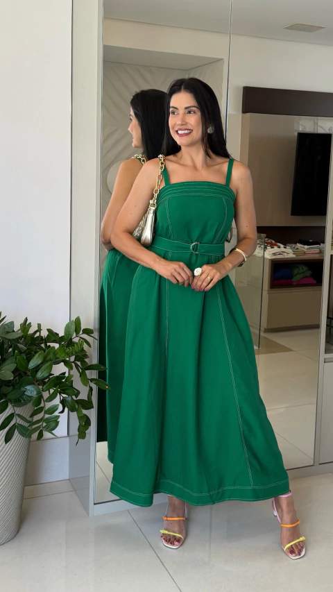 O Vestido Vania foi pensado para quem busca presença e sofisticação sem esforço. O corpete estruturado valoriza o colo, as alças finas trazem leveza e o cinto ajustável define a cintura com extremo refinamento. A saia ampla confere movimento e elegância, criando um visual harmônico em qualquer ocasião. A costura contrastante destaca o design e alonga a silhueta. O tecido tem toque macio, excelente caimento e estabilidade, garantindo conforto o dia inteiro.